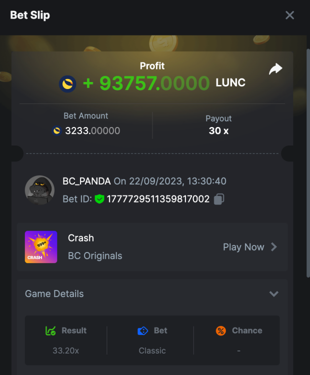 $5k Prestige Crash Challenge #107 DURATION: 22nd SEP - 29th SEP 13:20 pm UTC Dear esteemed VIP members, it's our pleasure to welcome you once again for an exhilarating week of contests and fervor from 22nd September to 29th September. Gear up for the much-awaited Prestige Challenge, a platform to showcase and push your Crash skills to the pinnacle. The focus of this week's tournament is on attaining the top multipliers, guaranteeing a heart-racing encounter unlike any other. The rules are clear-cut, and with a prize pool that's too tempting to resist, be assured that the competition is fiercer than ever. Let's dive into this remarkable challenge without any further ado. Kindly peruse the attached terms and conditions with utmost diligence. What's the Challenge? Win the highest multiplier you can on BC.Game's in-house game, Crash. If there is a tie, the player with the higher average bet amount (in USD) shall be the winner. If there is a tie in the amount and payout, the one who posted or edited his post first will be considered in the Ranking. How to Enter To enter, copy the link of the bet you'd like to submit. Once you've copied it, paste it as a reply to this thread like so: Link: https://bc.game/#/sd/11IMVWRRUCY1XZ In the same post, upload a screenshot of your win by clicking the game ID WITH VIEW IN USD mode ENABLED (accessible at the bottom of dropdown menu for your wallet up top. This way, we can ensure that your bet indeed met the minimum requirement at the time of placing it: Link: https://bc.game/#/sd/11IMVWRRUCY1XZ Minimum VIP Minimum VIP 4 with phone verified will be eligible! Minimum Payouts Minimum payout to qualify is 20x Minimum Bet Size $0.2 USD equivalent Eligible Coins All cryptocurrencies are eligible (excepting JB) Available Prizes GENERAL TERMS Please combine all of your hits together in a SINGLE post. Edit your existing post for additional hits, don't create a new post. Each eligible entry must have the Bet Slip URL, failure to include it will disqualify participation in the event. Bet Slip image is not mandatory. Bets must be posted within 24 hours of placing bet in order to keep things fair for everyone. Bets must be made during the specified time window stated above. This thread will lock automatically when the time period is over. One (1) entry per household. Anyone found attempting to win multiple prizes will be disqualified from this challenge as well as all future challenges. Failure to follow instructions will result in your submission being null and void. By entering this challenge, you acknowledge that BC.Game has the final decision on results and placement. Payouts will be distributed after the event is finished. Please note that it could take anywhere between 24 hours to 7 days after the completion of the event.