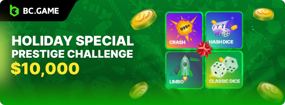 $10k HOLIDAY SPECIAL PRESTIGE CHALLENGE DURATION: 23rd December – 2nd January, 08:30 am UTC Celebrate the festive season with BC.GAME's "Christmas & New Year Special Prestige Challenge"! Dive into the holiday spirit with our exciting lineup of games: Crash, Limbo, Hash Dice, and Classic Dice. This special event is your chance to end the year on a high note and ring in the new year with spectacular wins! Join us on a festive gaming spree where the excitement never ends. Challenge yourself in any of our four featured games and aim for the highest multipliers. It's a holiday extravaganza with a competitive twist! What's the Challenge? Achieve the highest multiplier possible in our exclusive games: Crash | Limbo | Classic Dice | Hash Dice In the event of a tie, the winner will be determined by the higher average bet amount (in USD). Should there be a tie in both the amount and payout, priority in the ranking will be given to the player who first posted or edited their entry. How to Enter To enter, copy the link to the bet you'd like to submit. Once you've copied it, paste it as a reply to this thread, like so: Link: https://bc.game/#/sd/11OYP94GH5IXXJ In the same post, upload a screenshot of your win by clicking the game ID WITH VIEW IN USD mode ENABLED (accessible at the bottom of the drop-down menu for your wallet up top). This way, we can ensure that your bet indeed meets the minimum requirement at the time of placing it: Minimum VIP A minimum of Level VIP 4 with phone verified will be eligible! Minimum Payouts The minimum payout to qualify is 20x Minimum Bet Size $0.30 USD equivalent Eligible Coins All cryptocurrencies are eligible (excepting JB) Available Prizes GENERAL TERMS Please combine all of your hits into a single post. Edit your existing post for additional hits; don't create a new post. Each eligible entry must have the Bet Slip URL; failure to include it will disqualify participation in the event. The Bet Slip image is not mandatory. Bets must be posted within 24 hours of placing the bet in order to keep things fair for everyone. Bets must be made during the specified time window stated above. This thread will lock automatically when the time period is over. One (1) entry per household. Anyone found attempting to win multiple prizes will be disqualified from this challenge as well as all future challenges. Failure to follow the instructions will result in your submission being null and void. By entering this challenge, you acknowledge that BC.Game has the final say on results and placement. Payouts will be distributed after the event is finished. Please note that it could take anywhere from 24 hours to 7 days after the completion of the event.